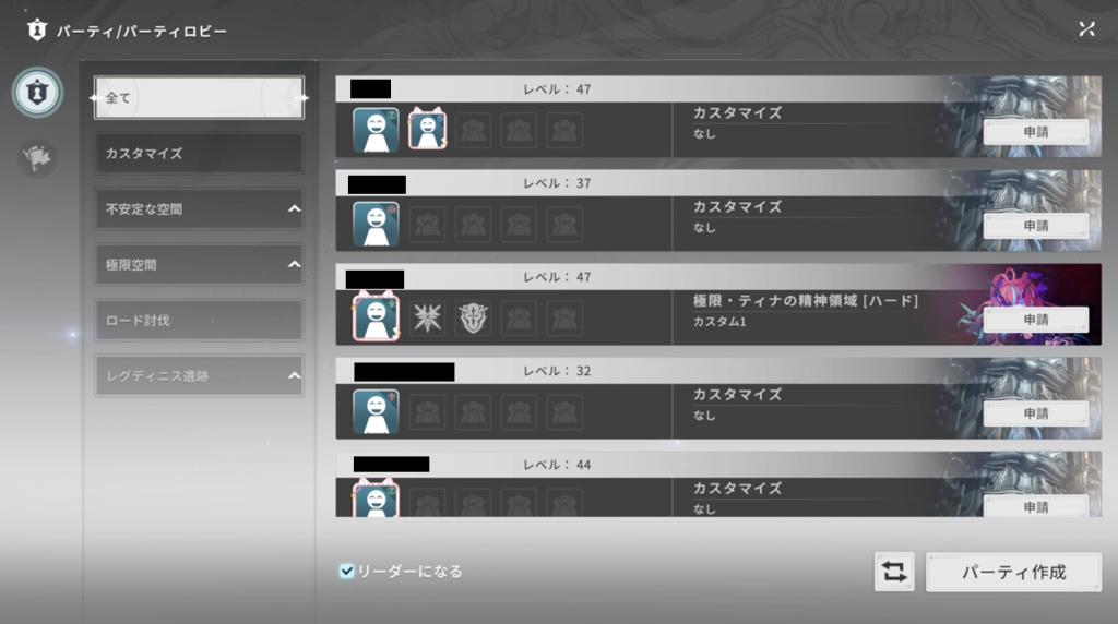 一応「パーティー一覧」はありますが、コメントを付けられないため、内容が分からないまま参加するのは少し勇気が必要です。